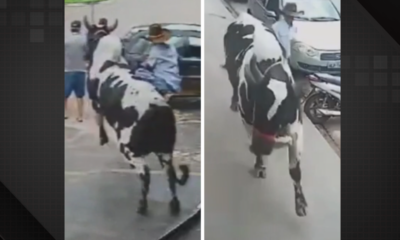 Um boi descontrolado fugiu de seu dono em disparada pelas ruas da cidade de Jaraguá, em Goiás. O animal de grande porto derrubou o dono que...
