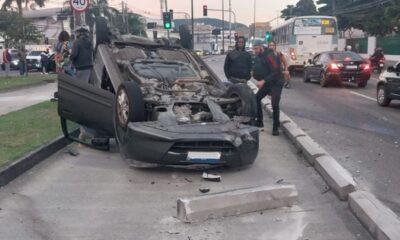Um carro capotou após um grave acidente com outro veículo, na manhã desta segunda-feira (4), na Estrada dos Bandeirantes, na altura da estação Merck, em Taquara,...
