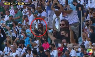 O apresentador Fausto Silva, o Faustão, foi flagrado em à torcida do Santos, na arquibancada do estádio do Maracanã, durante a final da Copa Libertadores da...