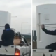 Dois homens foram flagrados na tarde desta segunda-feira (15), atravessando a ponte Rio-Niterói na caçamba de uma picape com uma geladeira e outras cargas presas ao...
