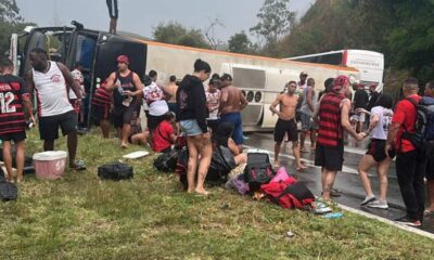 Um ônibus com torcedores do Flamengo tombou na Rodovia Presidente Dutra, na altura de Volta Redonda/Barra Mansa, a caminho da Argentina, onde o clube enfrenta o...