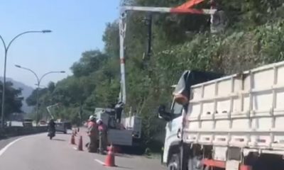 Equipes da Light atuam, na manhã desta sexta-feira (28), na autoestrada Grajaú-Jacarepaguá, na pista sentido Zona Norte. Os funcionários da empresa atuam no reparos de fios...