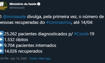 O Ministério da Saúde divulgou nesta terça-feira (14) que dos 25.262 casos confirmados de coronavírus no Brasil, 14.026 são de pessoas recuperadas da doença. O número...