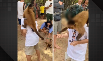 Um macaco foi visto pulando nas costas de um menino para tentar pegar a comida que ele carregava. A reação inusitada do garoto, entregando a comida...