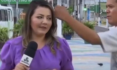 Pelas imagens, é possível perceber que a jornalista não percebeu a aproximação de um homem durante o link ao vivo. No vídeo, um indivíduo se aproxima...
