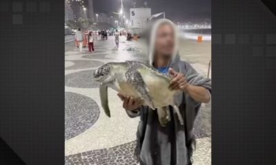 Um homem foi flagrado carregando uma tartaruga marinha nas mãos na Praia de Copacabana, na altura do Posto 5, Zona Sul do Rio. Segundo informações preliminares,...
