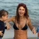 A atriz apareceu de biquíni preto, com saia listrada e óculos escuros
