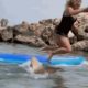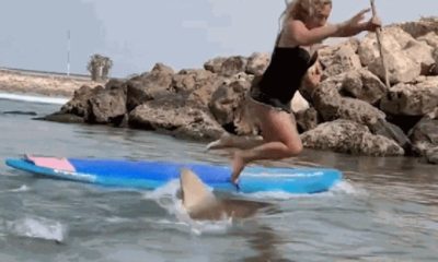 Enquanto banhistas se protegem de um tubarão-azul na beira da praia, um cachorro corajoso pula no mar, nada até o animal e dá uma mordida em sua cauda....