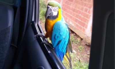 Uma arara-azul pousou na janela de uma viatura da Polícia Militar, nesta sexta-feira (10), em Itaperuna, na Região Noroeste do Rio. De acordo com a corporação,...