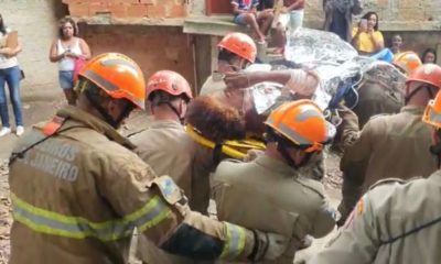 Depois de pouco mais de 5 horas de trabalhos o Corpo de Bombeiros conseguiu resgatar Lucas da Silva, de 18 anos, que estava preso pelas pernas...