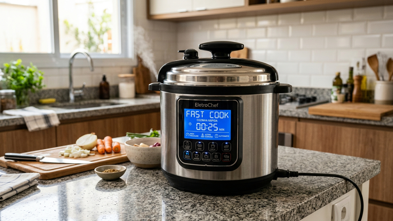 O aparelho é a panela de pressão elétrica. Ela tem se tornado uma das principais escolhas de quem quer otimizar a rotina na cozinha sem perder qualidade no preparo.