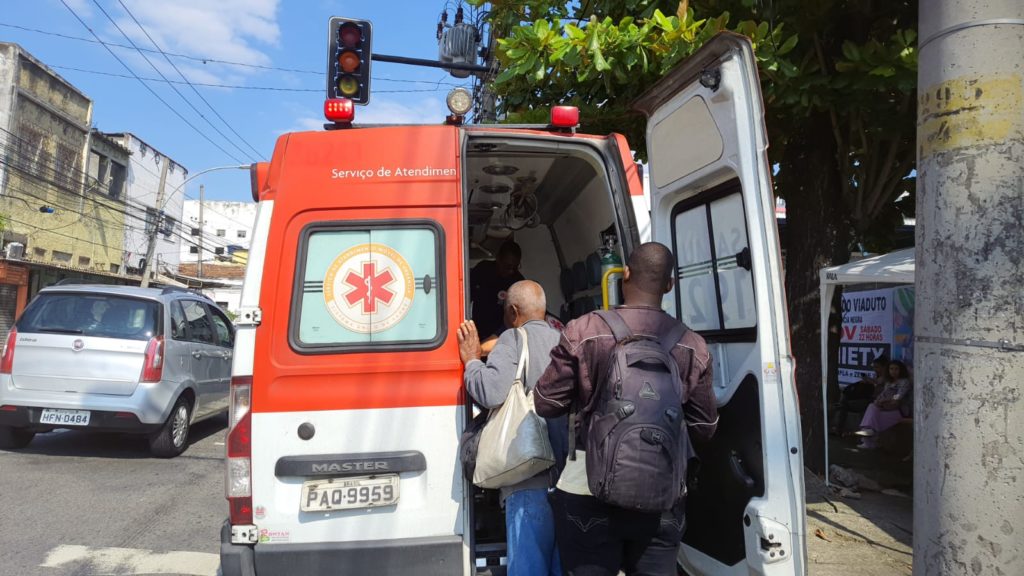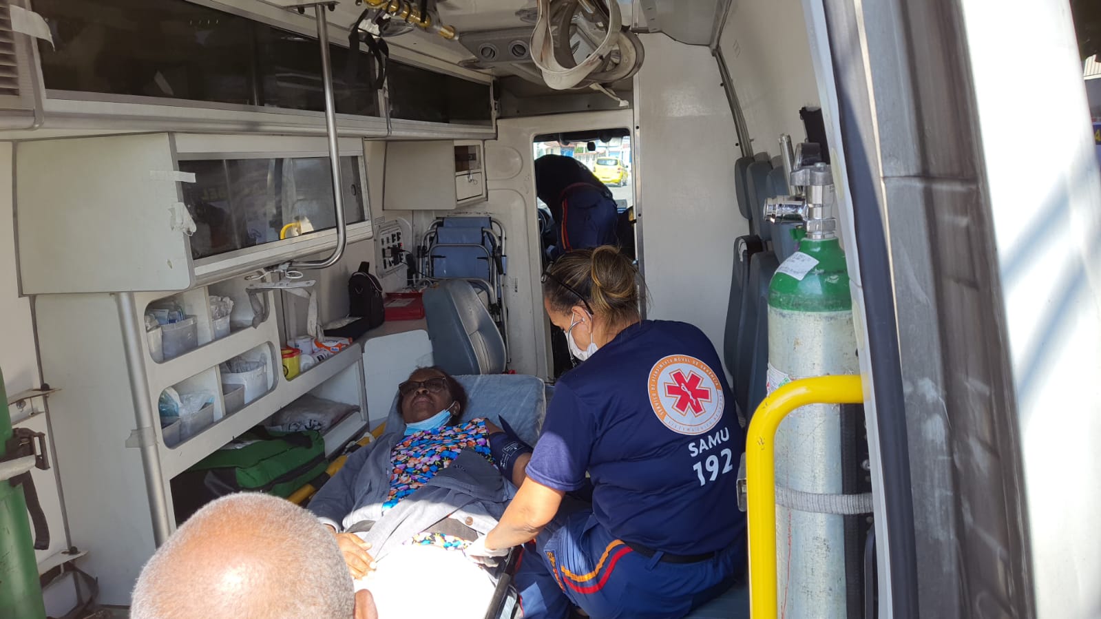 Uma aposentada de 65 anos, identificada como Jandira de Jesus, passou mal e precisou ser socorrida pelo Samu. Ela recebeu ajuda de Adriana Malta, uma moradora de Quintino que viu Jandira caindo e chamou o socorro.