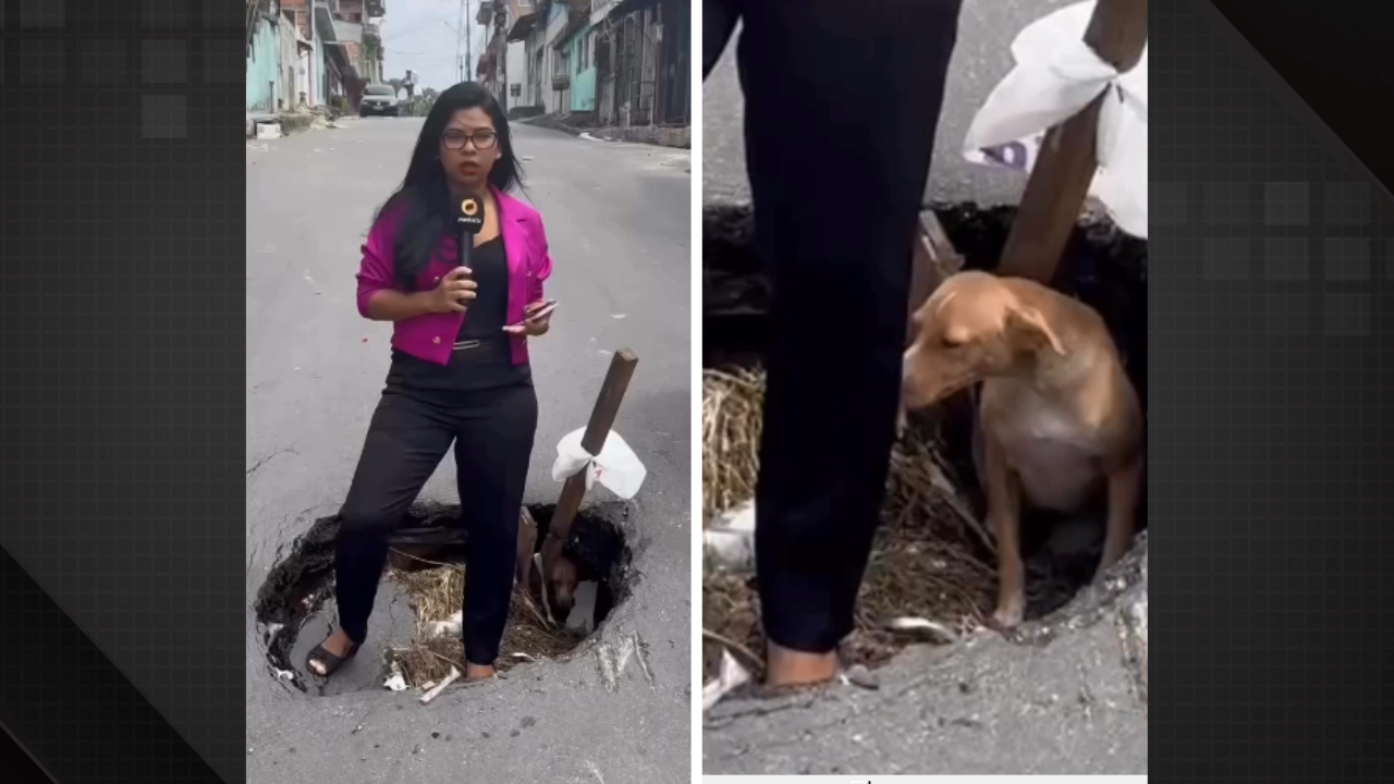 Animal saiu de dentro de um buraco que era o motivo da reportagem que estava sendo gravadaUm cachorro caramelo interrompeu uma reportagem na cidade de Manaus, no Amazonas, de uma forma inusitada nesta semana. A jornalista Brenda Karollyne, gravava uma reportagem a respeito de um buraco em uma das ruas da cidade quando inesperadamente, o animal saiu de dentro do local surpreendendo a repórter.