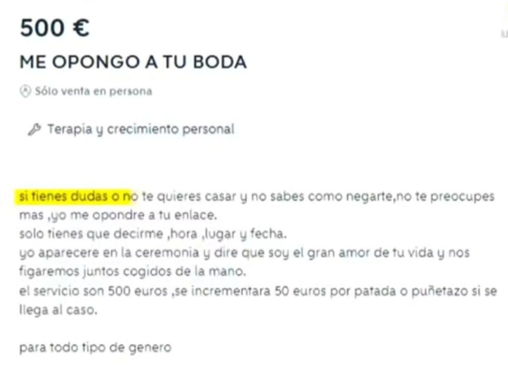 “Tem dúvidas ou não quer se casar e não sabe como negar? Não se preocupe mais, eu serei contra o seu casamento. Apareço na cerimônia, digo que sou o amor da sua vida e saímos de mãos dadas”, dizia o anúncio.