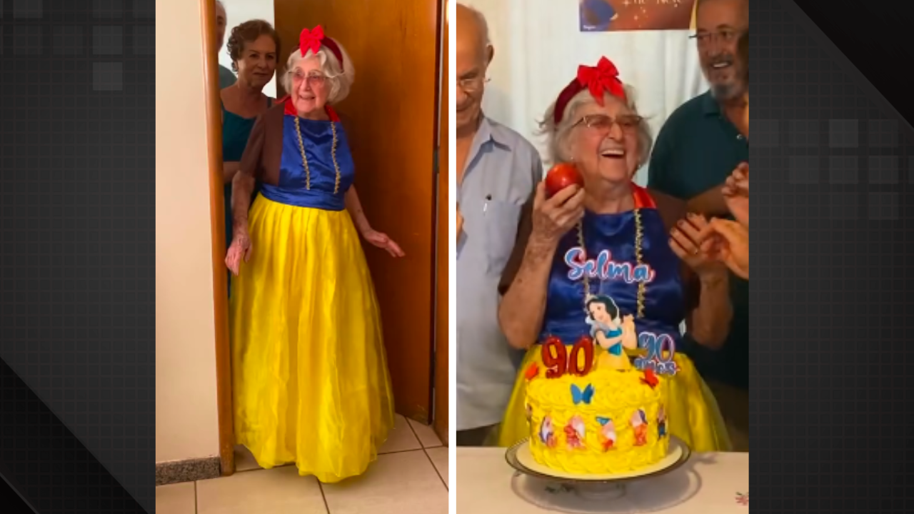 Bruna Fernandes, neta da aniversariante, foi a responsável por compartilhar o vídeo nas redes sociais. A gravação mostra a idosa vestida de Branca de Neve, cercada por familiares, incluindo seus sete filhos, em uma representação divertida dos personagens do conto. O momento que mais chamou a atenção foi quando a senhora simulou a famosa cena da maçã envenenada, recriando o desmaio icônico e sendo “acordada” por um beijo do marido, em uma clara referência ao conto infantil.