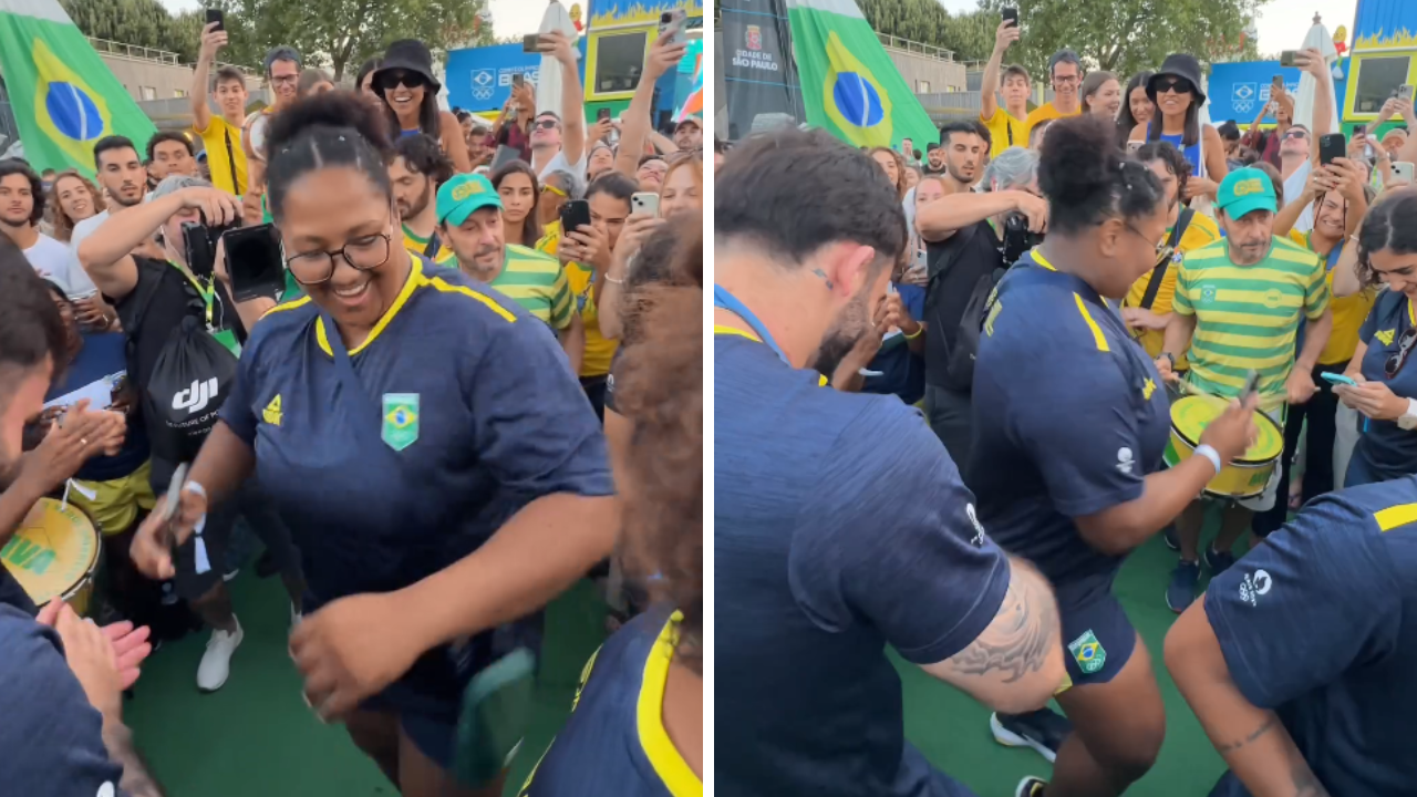 Beatriz Souza, judoca brasileira que conquistou a histórica medalha de ouro ao lado da equipe brasileira de judô que conquistou a medalha de bronze nas Olimpíadas, caiu no samba durante comemoração das conquistas em Paris.
