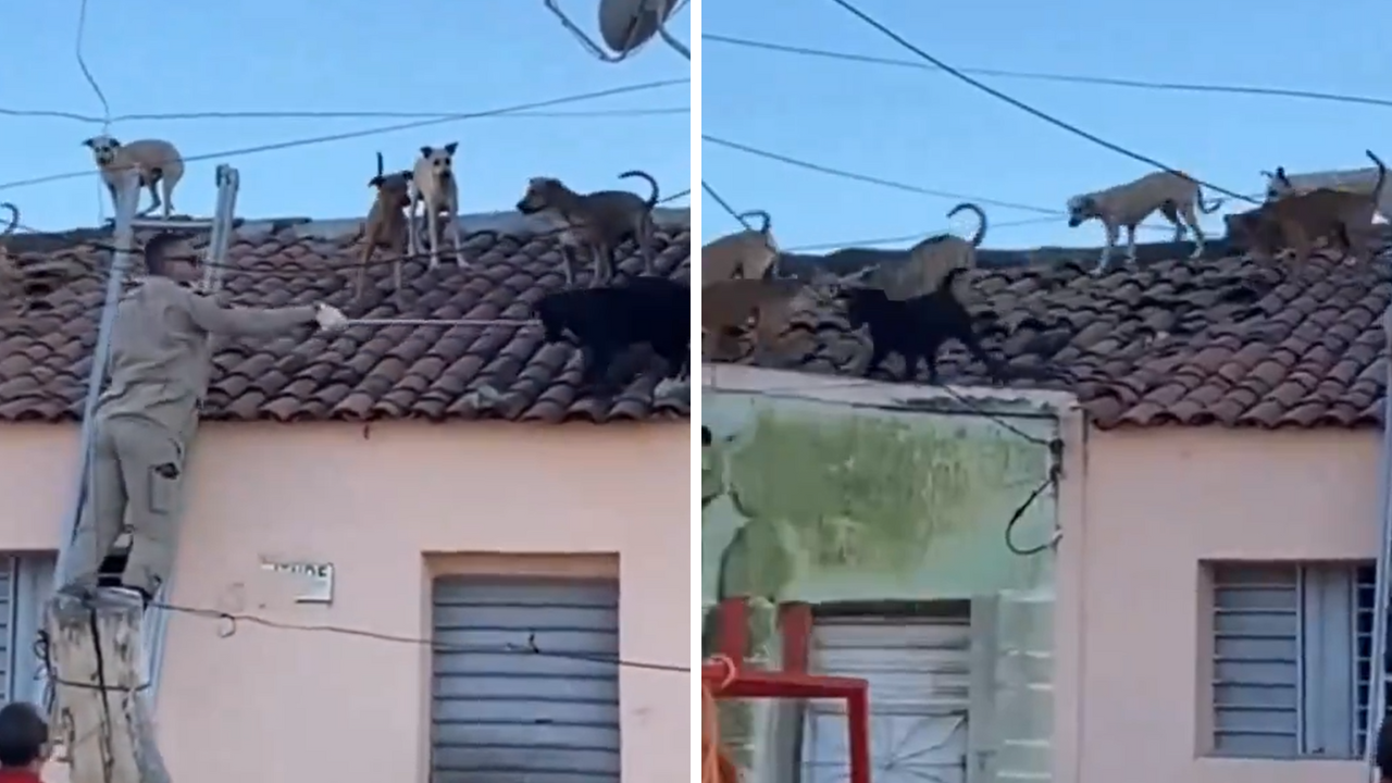 Vídeo: cachorros sobem em telhado e são resgatados pelos bombeiros