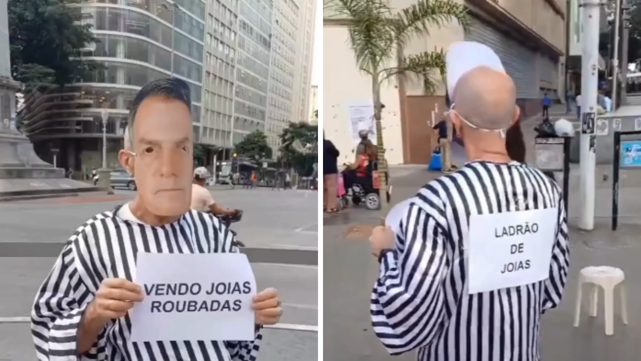 Munish Prem, vestido com uma roupa de presidiário e uma máscara com o rosto do ex-presidente segurava um cartaz com a frase “Vendo joias roubadas”. A Praça Sete, local onde foi realizado o ato, é conhecida como um ponto de compra de joias em Belo Horizonte.
