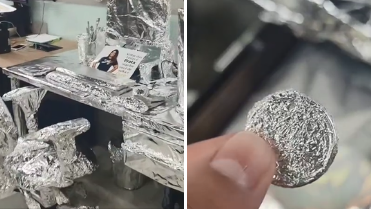 Vídeo: jovem é surpreendida ao retornar de férias e encontrar escritório totalmente embalado em papel alumínio