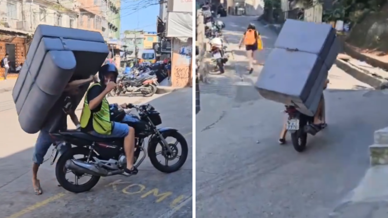 Em vídeo gravado por um morador, o jovem aparece carregando o móvel nas costas e sobe na garupa da moto para subir o morro em direção ao local da mudança.