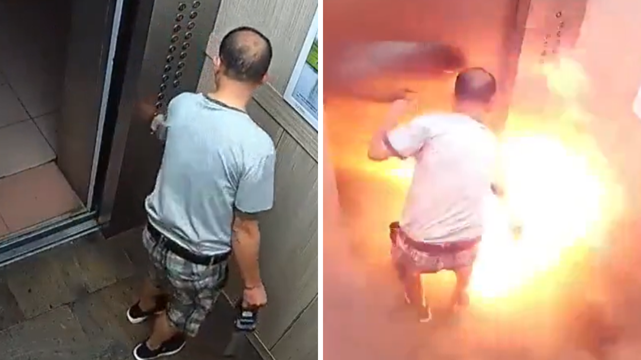 Imagens mostram um homem entrando no elevador com uma bateria de lítio, segundos antes dela explodir