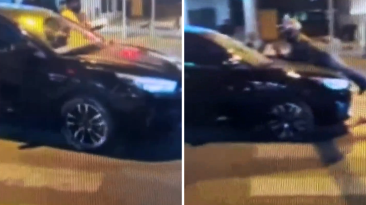 Nas imagens é possível ver o motociclista na frente do carro preto, pedindo para o motorista parar. Ao se recusar a parar, o motociclista sobe no capô do carro.