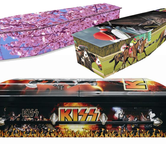 Uma empresa funerária da Inglaterra faz a fabricação de caixões personalizados, com estampas e formatos variados e exclusivos, para atender ao gosto do 'cliente'.