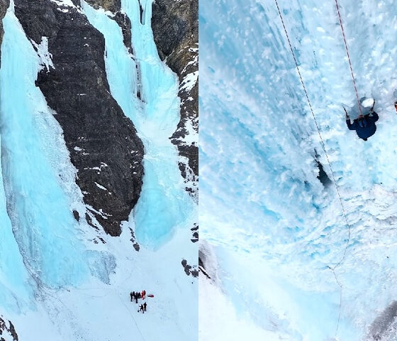 Cachoeira congelada: O influenciador e seus amigos foram deixados de helicóptero para escalar uma enorme cachoeira de gelo na Europa (o local exato não foi revelado). Um deles acabou desistindo no meio do caminho.